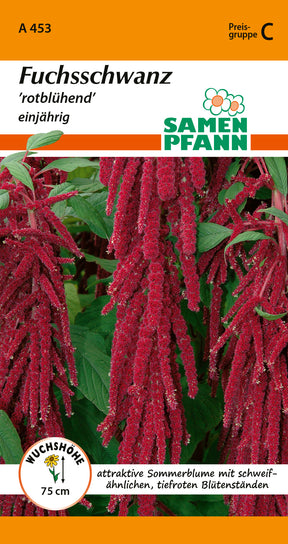 Amaranthus caudatus Fuchsschwanz ’rotblühend’ Der Fuchsschwanz, auch als Amarant oder Inkaweizen bekannt, ist eine attraktive Sommerblume. Seine hängenden, tiefroten Blütenstände können Längen von bis zu 50 cm erreichen und gleichen im Anblick einem Fuchsschwanz - daher auch der Name.