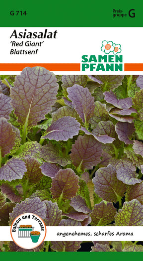 Brassica juncea Asiasalat ’Red Giant’ Blattsenf mit glatten, spitz zulaufenden grün-roten Blättern. Angenehmes scharfes Senfaroma, Schärfe nimmt mit zunehmendem Alter zu. Gut für Herbst- und Winteranbau geeignet, da sehr kältetolerant. Verwendung roh als Salat oder gekocht bzw. gedünstet.