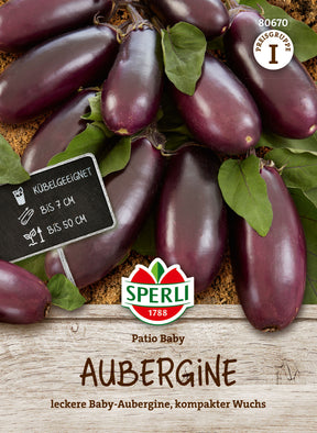 Die Aubergine 'Patio Baby' ist eine kompakt wachsende und daher auch für Kübel geeignete F1-Hybride, die leckere kleine Baby-Auberginen mit einer Länge von 5 bis 7 cm hervorbringt. Die ca. 50 cm hohe Pflanze beeindruckt mit einem langen Erntezeitraum von Juli bis September, in welchem sie Frucht um Frucht produziert. Nicht umsonst ist sie schließlich Gewinnerin des All-America-Selections-Award. 'Patio Baby' wird im Februar und März im Haus vorkultiviert und fühlt sich später im Freiland an sonnigen Standorten besonders wohl.