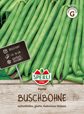 Die dunkelgrünen Hülsen der Buschbohne 'Sigma' werden bis zu 16 cm lang. Die Sorte zählt zu den vollfleischigen, ertragreichen Bohnen. Sie reift ab Juli und sticht nicht zuletzt wegen ihres vollmundigen Geschmacks hervor. Das Besondere dieser Sorte ist nicht nur, dass die Bohnen eingefroren werden können, sondern auch ihre zahlreichen Resistenzen. Die Pflanzen benötigen keinen Dünger, da sich an ihren Wurzeln Knöllchenbakterien bilden, die den Stickstoff aus der Luft binden und an die Pflanzen weitergeben.