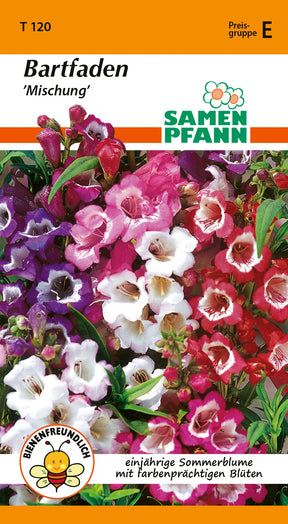Penstemon hartwegii Bartfaden ’Mischung’ Einjährige Sommerblume mit großen, farbenprächtigen Blüten. Eignet sich für Rabatten, Beete, Kübel als auch zum Schnitt. Bartfaden wird von Schnecken weitestgehend vermieden.
