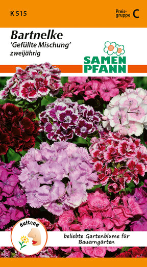 Dianthus barbatus Bartnelke ’Gefüllte Mischung’ Eine der beliebtesten Gartenblumen für Beet und Schnitt, besonders beliebt im Bauerngarten. Blüht vom Frühling bis in den Sommer. Sehr haltbar, intensiver Duft.