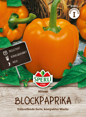 Die Paprika 'Milena' von SPERLI ist eine früh heranreifende F1-Hybride mit süßen, knackigen Früchten in oranger Farbe. Die Blockpaprika liefert von August bis Oktober hohe Erträge. Da sie sehr kompakt wächst, kommt nach der Vorkultur neben dem Freilandanbau auch eine Anzucht im Kübel infrage. Um Blütenendfäule vorzubeugen, ist eine ausgewogene Düngung wichtig, hier vor allem auch mit Calcium. Insgesamt ist 'Milena' aber eine von Natur aus sehr widerstandsfähige Sorte, der zum Beispiel Viruserkrankungen kaum etwas anhaben können.