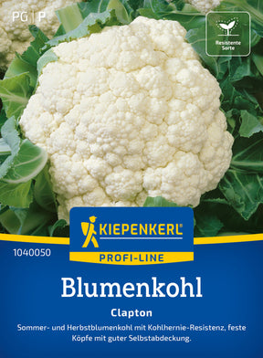 Der Blumenkohl 'Clapton' bildet feste, reinweiße Köpfe mit aromatischen, zarten Blumen. Eine robuste, ertragreiche Spitzensorte mit guter Selbstabdeckung, die Umblätter müssen nicht zum Schutz vor Sonneneinstrahlung eingeknickt werden. Eignet sich für die Sommer- und Herbsternte. 'Clapton' ist resistent gegen Kohlhernie.