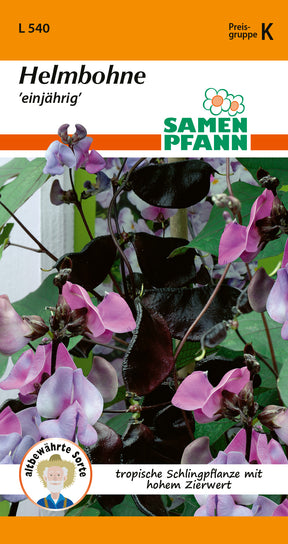 Dolichos lablab Helmbohne ’einjährig’ Diese exotische Kletterbohne besitzt nicht nur violette Blüten, auch die Hülsenfrüchte sind in einem dunkel-violetten Farbton äußerst attraktiv anzuschauen. In Europa wird die Helmbohne hauptsächlich zur Zierde angebaut, in Afrika und Indien ebenfalls als Nahrungsmittel und Heilpflanze. Sie ist trockenresistent und kann bis zu 3 m hoch wachsen.
