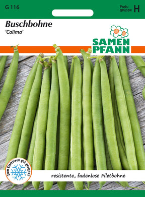 Phaseolus vulgaris Buschbohne ’Calima’ Frühe, langhülsige, fadenlose Filetbohne mit runden, dunkelgrünen 18-20 cm langen Hülsen. Schnelles Wachstum, kräftiger aufrechter Pflanzenwuchs. Resistent gegen Bohnenmosaikvirus, Brenn- und Fettflecken. Kornfarbe dunkelbraun marmoriert.