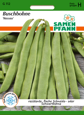 Phaseolus vulgaris Buschbohne ’Nassau’ Fadenlose, frühe, grüne, zuverlässige Bohne. Die Flachen geraden Hülsen sind ca. 16 cm lang und ca. 17 mm breit. Sehr ertragreich, hervorragender Geschmack, aufrechter Wuchs mit freihängenden Hülsen. Resistent gegen Bohnenmosaikvirus, Brenn- und Fettflecken. Kornfarbe weiß.