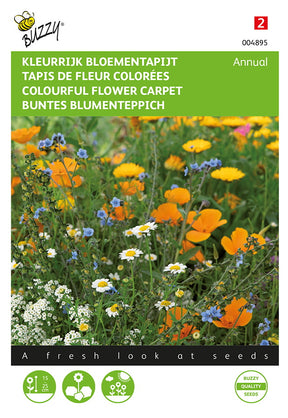 Buntes Blumenteppich - Jährlich Ab Mitte April bis Ende Juni ins Freiland breitwürfig oder in Reihen einsäen. Eine wunderschöne, farbenfrohe Mischung aus Pflanzen, die sich besonders gut zwischen Steinen, Fliesen und im Steingarten eignen.