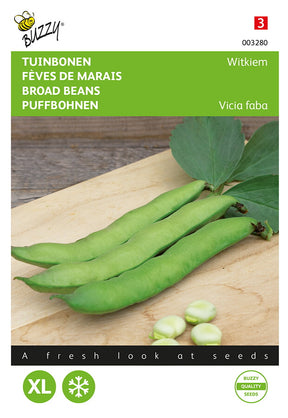 Puffbohnen - Frühe Weißkeimige Unter Glas im Januar vorziehen und Anfang März ins Freie auspflanzen oder von März bis Mitte April direkt im Freien aussäen. Die dicke Witkiem-Bohne ist eine sehr bekannte, ertragreiche Sorte mit etwa 4 bis 5 großen Bohnen pro Hülse. Beim Kochen färben sie sich braun und schmecken besonders gut.