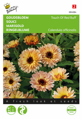 Ringelblume - Touch of Red Buff Spezielle Ringelblumen-Variante mit wunderschönen aprikosenfarbenen Blüten. Ende März bis Mitte Juni breit gestreut oder in Reihen direkt ins Saatbeet aussäen. Etwas ausdünnen. Leicht anzubauen und dank ihres robusten Stängels auch eine gute Schnittblume. Ringelblumen haben eine heilende Wirkung und lassen sich hervorragend in Tee oder Salaten verarbeiten.