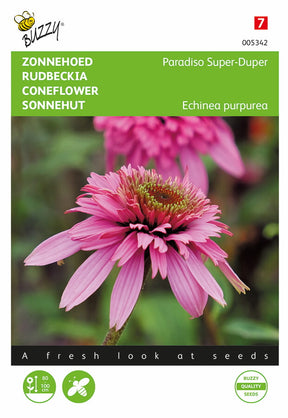 Sonnenhut - Paradiso Super-Duper Die Rudbeckie Paradiso Super-Duper hat wunderschöne rosafarbene Blüten, die sich am gleichen Stängel doppelt ausbilden. Im ersten Jahr können noch Einzelblüten erscheinen, doch je älter die Pflanze wird, desto voller werden die Blüten. Rudbeckien lieben Sonne und sind trockenheitsresistent. Mitte März bis Mitte April unter Glas oder Mitte April bis Ende Mai im Freiland ins Saatbeet aussäen. Nach 5 bis 6 Wochen auspflanzen.