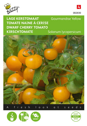 Niedrige Kirschtomate - Gourmandise Yellow Ab Februar ins Frühbeet bei 20°C oder später draußen unter Glas. Einmal pikieren und in Gewächshaus oder Töpfe auspflanzen. Gourmandise wird nur ca. 30 cm hoch und bringt eine Vielzahl von kirschgroßen, zuckersüßen Früchten.