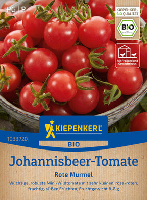 Die BIO-Johannisbeertomate 'Rote Murmel' ist eine ertragreiche, wüchsige Wildtomate mit kleinen, rosa-roten, fruchtig-süßen, 6-8 g schweren Früchten. Ideal zum Naschen direkt von der Pflanze. Diese Tomaten müssen nicht ausgegeizt oder hochgebunden werden. Johannisbeertomaten sind sehr robust.