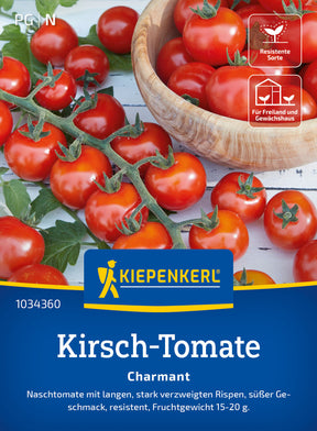 Die Kirschtomate 'Charmant' bildet kleine, rote, süße, platzfeste, 15-20 g schwere Früchte an langen, verzweigten Rispen. Zur Ernte als Einzelfrucht. Sie eignet sich fürs Gewächshaus, größere Kübel, aber auch für geschützte Stellen im Freiland und ist resistent gegen verschiedene Welke- und Blattkrankheiten, Mosaikvirus sowie Nematoden. Wuchshöhe 150-200 cm.