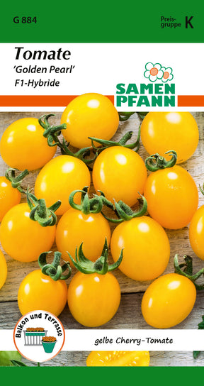 Solanum lycopersicum Tomate, Cherry-Tomate ’Golden Pearl, F1-Hybride’ Sehr frühe, platzfeste Cherry-Tomate mit ca. 13-18 g schweren, uniformen Früchten von leuchtend gelber Farbe. Hervorragender Geschmack durch ausgewogenes Zucker-Säure-Verhältnis. Für Unterglasanbau und Freiland geeignet, gut für Balkon und Terrasse im Kübel.