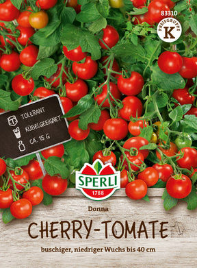 Die Tomate 'Donna' ist eine sehr ertragreiche Cocktailtomate in Premiumqualität. Jede Pflanze trägt im Zeitraum von Juli bis Oktober im Schnitt mehr als 100 Früchte, wobei pro Traube bis zu 10 Früchte ausgebildet werden. 'Dona' eignet sich ideal für die Topfkultur und wird, je nach Größe des Topfes, ca. 20 bis 40 cm hoch. In die Breite wächst sie bis zu 60 cm. Das oft notwendige Ausbrechen der Seitentriebe ist bei dieser sehr widerstandsfähigen F1-Hybriden nicht notwendig, was sie auch zu einer guten Ampelpflanze macht.