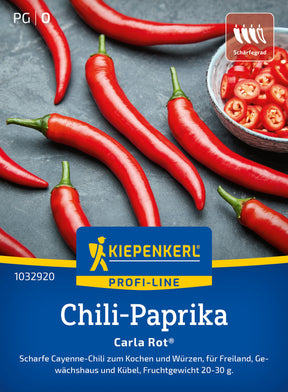Die Chilipaprika 'Carla Rot®' bildet von Grün nach Rot abreifende, schlanke, 15-20 g schwere Früchte. Sie gehören mit ca. 50.000 Scoville zu den scharfen Chilis. Rote Früchte in kleinen Mengen frisch oder getrocknet verwenden. Für geschützte Stellen im Freiland, Gewächshaus, Hochbeet und Kübel. Wuchshöhe 80-100 cm.