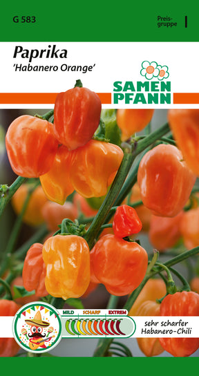 Capsicum annuum Paprika, Chili ’Habanero Orange’ Sehr scharfer kleinfrüchtiger, oranger Chili. Gedrungene, kompakte Pflanzen mit kleinen, schön geformten orangen, sehr scharfen Früchten. Habanero-Paprika zählt zu den schärfsten der Welt. Können frisch oder getrocknet in kleinen Mengen zum Würzen verwendet werden. Früchte von Kindern fernhalten!