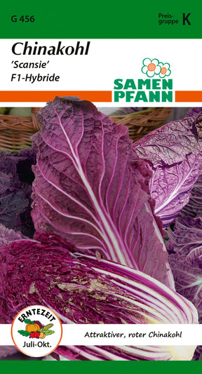 Brassica rapa Chinakohl ’Scansie F1’ Scansie F1 ist ein attractiver, intensiv roter Chinakohl. Gute Schossfestigkeit und sehr gut lagerfähig. Mild im Geschmack, vielseitige Zubereitung wie bei grünen Sorten.