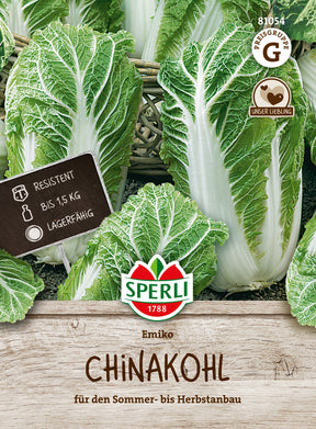 Feste, geschlossene und mittellange Köpfe bringt der Chinakohl 'Emiko' in Deinen Garten. Die einzelnen Köpfe haben ein dunkelgrünes Umblatt und erreichen ein Kopfgewicht von 1 kg bis 1,5 kg. Die Erntezeit ist beeindruckend lang, denn sie dauert von Juli bis in den November hinein an. Im Anschluss eignet sich der Chinakohl 'Emiko' ideal für die Einlagerung bis ins nächste Jahr. Wenn Du eine Vorkultur angelegt hast, kann der Kohl ab Mai ins Freiland verpflanzt werden. Er liebt einen humosen, nährstoffreichen Boden. Zudem empfiehlt es sich, die Köpfe mit einem Insektenschutznetz abzudecken. Das beugt einem Befall durch die Kohlfliege und dem Kohlweißling vor. Des Weiteren ist der Chinakohl 'Emiko' resistent gegen Kohlhernie und widerstandsfähig gegen Fusarium-Welke.