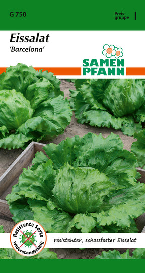 Lactuca sativa Salat, Eissalat ’Barcelona’ Mittelfrüher Saladin-Typ. Große, rund geformte und gut gefüllte Köpfe. Kräftig wachsend, schossen nicht, robust gegen Innenbrand. Für Frühjahrs-, Sommer- und Herbstanbau. Gute Haltbarkeit. Chem. Pflanzenschutz ist überflüssig, da resistent gegen Grüne Salatblattlaus und Falschen Mehltau.