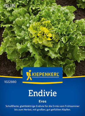 Die Endivie 'Eros' ist eine schossfeste, auch für die frühe Ernte im Frühsommer geeignete Endivie. Sie bildet große Köpfe mit dicht gefülltem Herz aus zarten, gelb-grünen, nur leicht bitteren Blättern. Auf das Bleichen kann verzichtet werden. Nur wer es besonders mild mag, kann das Herz durch Hochbinden oder Abdecken noch zusätzlich bleichen.