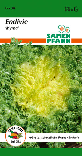 Cichorium endivia Endivie, Frisee-Endivie ’Myrna’ Frisee-Endivie mit feingeschlitzten Blättern, verbesserter Typ Wallone, für den Anbau vom Frühsommer bis in den Herbst. Halb aufrechter Wuchs mit sehr guter Füllung, hoher Gelbanteil und mild im Geschmack. Gut lagerfähig. Sehr robust und schossfest.