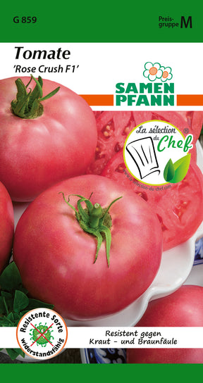 Solanum lycopersicoum Tomate ’Rose Crush F1’ Mittelfrühe, pinkfarbene Fleischtomate mit saftigen, aber schnittfesten Früchten. Leicht süßlicher, besonders guter Geschmack, verstärkt durch den UMAMI-Geschmack. Fruchtgweicht 200-250g. Sehr hohe Resistenz gegen Kraut-und Braunfäule.