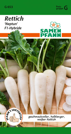 Raphanus sativus Rettich ’Neptun, F1-Hybride’ Geschmackvoller,halblanger (ca. 25-30 cm), extrem glatter, leicht waschbarer, weißer Rettich. Nur wenig, feine Seitenwurzeln. Gut abgestumpft, geringe Neigung zur Pelzigkeit. Laub dunkelgrün. Gute Schoßfestigkeit, geeignet zum Anbau von Frühjahr bis Herbst. Von Natur aus tolerant gegen Rettichschwärze, weitgehend schoßfest.