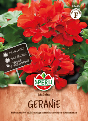 Bei der Geranie 'Madeira' handelt es sich um eine blühfreudige Balkonpflanze für Beete, Rabatten, Kübel und viele andere Gefäße. Sie erreicht eine Wuchshöhe von ca. 30 cm und bildet leuchtend rote Blüten von Mai bis Oktober. Damit die Pflanzen so ausdauernd blühen können, ist es wichtig, die verblühten Blumen auszubrechen. 'Madeira' liebt nährstoffreiche, durchlässige Böden in sonniger, teilweise auch halbschattiger Lage. Von Dezember bis März wird das Saatgut in kleine Schalen ausgebracht, samendick mit Erde bedeckt und die Aussaat anschließend angedrückt, angegossen und mit einer Folie bis zum Auflaufen überdeckt. Nach der Entwicklung des ersten Laubblattes sollten die jungen Pflanzen pikiert und nach Entwicklung des 6. Blattpaars entspitzt werden, damit sie sich besser verzweigen. Tipp: Die aus Samen gezogenen Pflanzen sind widerstandsfähig gegenüber Krankheiten und eignen sich besser für die Beetbepflanzung als aus Stecklingen gezogene Pflanzen.