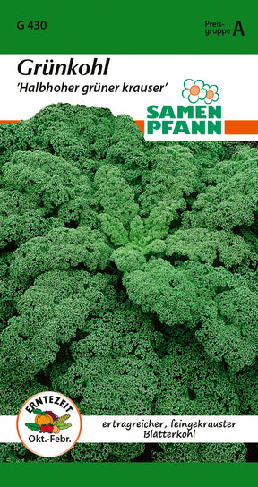 Brassica oleracea Grünkohl ’Halbhoher grüner krauser’ Besonders feingekrauste, sehr ertragreiche Sorte. Grünkohl wird meist als Nachfolge von frühem Gemüse oder Kartoffeln angebaut. Soll nicht vor dem ersten Frost geerntet werden, da dieser ihn schmackhaft macht. Auch als Futter für Kleintiere geeignet.