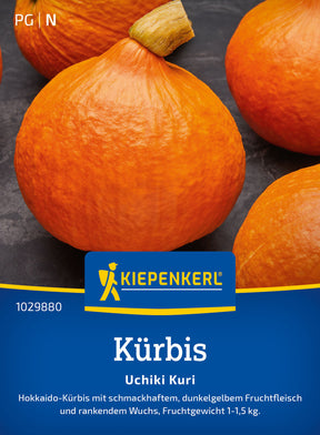 Der Hokkaido-Kürbis 'Uchiki Kuri' bildet tropfenförmige, orangene, 1-1,5 kg schwere Früchte. Das Fruchtfleisch hat ein nussig-kastanienartiges Aroma. Sie können mit Schale vielseitig verwendet werden. Die Pflanzen haben einen mittelstarken, rankenden Wuchs. Wuchshöhe 50-60 cm.