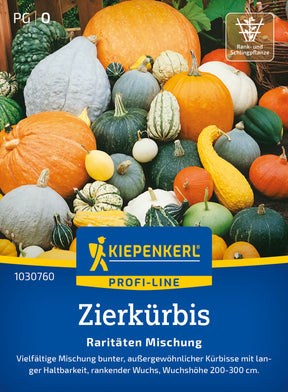 Die 'Raritäten Mischung' bildet bunte, vielfältig geformte, außergewöhnliche Zierkürbisse in unterschiedlichen Größen. Sie sind lange haltbar und können als Ranker an Zäunen, Mauern oder Spalieren, aber auch im Beet bodendeckend angebaut werden. Wuchshöhe 200-300 cm.
