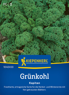 Der Grünkohl 'Kapitan' bildet dunkelgrüne, fein gekrauste, feste Blätter. Die Pflanzen werden ca. 80 cm hoch. Eine frostharte, anbausichere Sorte zur laufenden Ernte vom Herbst bis zum Februar. Stets bei frostfreiem Wetter ernten.