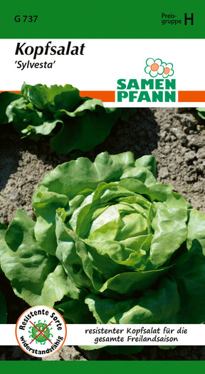 Lactuca sativa Salat, Kopfsalat ’Sylvesta’ Großer, mittelgrüner, schwerer, dickblättriger Kopfsalat für die komplette Freilandsaison. Hitzebeständig und schossfest. Resistent gegen die Grüne Salatblattlaus und Mehltau. Sehr ertragreich.