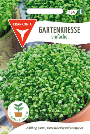 Gartenkresse wird im frischen Zustand für Salate, Quark, zum Garnieren oder als Brotbelag verwendet. Mit einem pikanten, herbwürzigen, sehr aromatischen Geschmack ist sie eine ideale Vitaminquelle. Auch ganzjähriger Anbau im Haus möglich.
