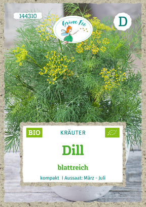 Einjährig, sattgrüne, kompakte, sehr blattreiche Dillsorte, spätschossend, gleichmäßige Entwicklung, geschmacksintensives Würzkraut für Gurken, Fisch, Fleisch, Kräuterbutter, zum Tiefgefrieren geeignet