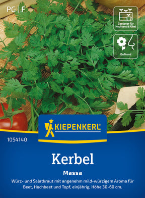 Der Kerbel 'Massa' überzeugt mit seinem feinen, süßlicharomatischen an Fenchel und Anis erinnernden Geschmack. Die gefiederten Blätter und Triebspitzen werden für Fleisch- und Fischgerichte, Salate und Suppen verwendet. Frisch verwenden, zum Konservieren portionsweise einfrieren.