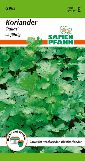 Coriandrum sativum Koriander ’Pallas’ Kompakt wachsender, spätschiessender Koriander. Sehr blattreiche, kleinfrüchtige Sorte. Für Gärten und in Töpfen. Koriander ist einjährig und gedeiht von Mai bis Oktober im Freiland oder ganzjährig in Töpfen. Sehr schossfest. Verwendet werden die Blätter fein gehackt in Suppen, Salaten und für die asiatische Küche.