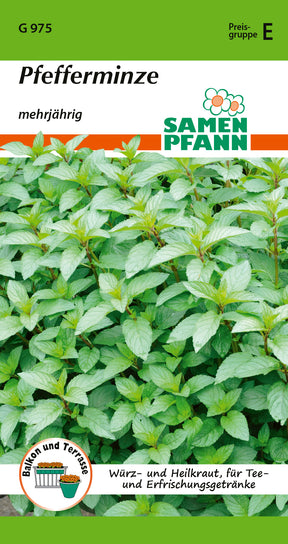 Mentha piperita Pfefferminze ’mehrjährig’ Verwendung vor allem zur Teeproduktion, bei Magenverstimmung, Blähungen, Galle und Darmbeschwerden. Auch als tägliches Erfrischungsgetränk beliebt. Frisch oder getrocknet zu Rohkostsalaten, Suppen, Marinaden und Soßen.