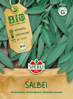 Der BIO-Salbei von SPERLI ist eine mehrjährige Heil- und Gewürzpflanze mit einem breiten, buschigen Wuchs und graugrünen, filzigen Blättern. Er ist ideal für die Kultur im Kübel geeignet. Geerntet werden im Zeitraum von Mai bis Oktober die frischen Blätter und Triebspitzen mit einem leicht bitteren, aromatischen Geschmack. Salbei sollte sparsam zum Würzen von Fleischgerichten, Fisch und Salaten sowie für Tee verwendet werden. Die Pflanzen lieben einen durchlässigen, eher kalkhaltigen Boden ohne Staunässe. Ab Mitte Mai können vorgezogene Jungpflanzen ins Freiland verpflanzt werden, sofern dieses sicher frostfrei ist. Im Winter muss der mehrjährige Salbei vor Kahlfrösten geschützt werden.