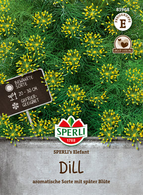 Der Dill 'SPERLI's Elefant' ist eine blattreiche Sorte mit hohem Krautertrag und Aromagehalt. Er ist insbesondere für die Freilandaussaat von April bis August geeignet und ideal für eine lange Ernte von Juni bis September, da die Blüte erst spät beginnt. Alternativ kann 'SPERLI's Elefant' im Gewächshaus von Februar bis Juni ausgesät und von April bis Dezember geerntet werden. Lockere, durchlässige und humose Erde ist im Freiland wie im Gewächshaus für eine erfolgreiche Kultur der schnellwüchsigen Pflanzen wichtig. In der Küche wird Dill frisch, getrocknet oder tiefgefroren zum Würzen von Essig, Salaten, Soßen und Fisch verwendet. Unentbehrlich ist er auch zum Einlegen von Gurken, wofür die Blütenkrone genutzt wird. Die Blätter können geerntet werden, sobald der Dill 20 bis 30 cm hoch ist.