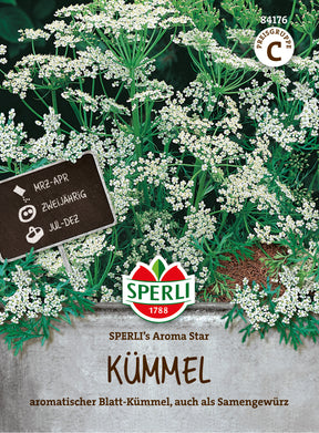 Der Kümmel 'SPERLI's Aroma Star' ist ein zweijähriges Heil- und Würzkraut, welches im ersten Jahr ein leuchtend grünes, möhrenähnliches Kraut entwickelt, das für Gemüse, Salate und Suppen verwendet wird. Im zweiten Jahr bildet die Pflanze ca. 1 m hohe Dolden mit Samen, die abgeschnitten und getrocknet werden, wenn sie sich braun verfärben. Der Samen ist sehr beliebt zum Würzen von Sauerkraut, Kohl, Gebäck, Brot, Käse, Soßen, Pilzen und zur Alkoholherstellung. Humose, tiefgründige Böden, die nicht zur Staunässe neigen, sind zusammen mit einem sonnigen Standort ideal für eine erfolgreiche Anzucht.
