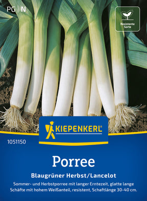 Der Porree 'Blaugrüner Herbst/Lancelot' bildet glatte, bis zu 40 cm lange Schäfte mit hohem Weißanteil und gesundem, blau-grünem Laub. Geeignet für Ernte vom Spätsommer bis zum Frühwinter, frühe Sätze können ab August als Sommerporree geerntet werden. Resistent gegen Alternaria- und Papier-Blattflecken sowie gegen Porree-Rost.