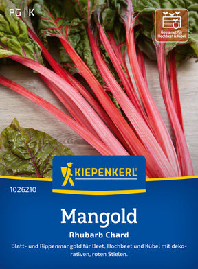 Der Mangold 'Rhubarb Chard' ist ein dekorativer Blatt- und Rippenmangold mit rot-grünen Blättern und roten Rippen. Die Rippen werden wie Spargel und die Blätter wie Spinat zubereitet. Beim Kochen bleiben Stiele und Blätter attraktiv rot-bunt, geeignet für Beet, Hochbeet und Kübel.