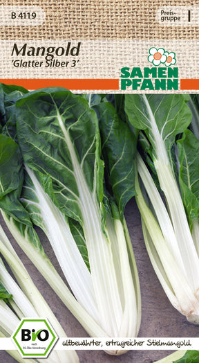 Glatter Silber ist ein klassischer Stielmangold mit breiten, silberweißen Rippen und dunkelgrünem Blatt. Robuste, hochwachsende und ertragsstarke Sorte. Im geschützten Anbau auch zur Überwinterung geeignet. Besonders schossfeste Selektion.
