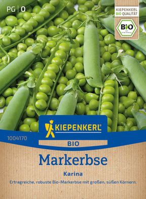 Die Bio-Markerbse 'Karina' bildet gut gefüllte Hülsen mit großen, zarten, süßen Körnern. 'Karina' benötigt eine Kletterhilfe. Erbsen am besten frisch verwenden oder tiefgefrieren. Ernte sobald sich die Körner gut entwickelt haben. Erbsen binden Stickstoff aus der Luft und sind damit wichtig für die Fruchtfolge. Wuchshöhe ca. 60-70 cm.