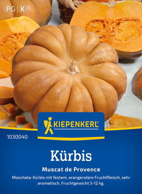 Der Moschata-Kürbis 'Muscat de Provence' bildet flachrunde, gerippte, bei Reife rotbraune, 5-12 kg schwere Früchte. Das feste, duftende Fruchtfleisch hat ein fein-würziges Aroma. Geeignet zum Einlegen, für Suppen und als Gemüse. Die Pflanzen haben einen stark rankenden Wuchs. Wuchshöhe 50-60 cm.