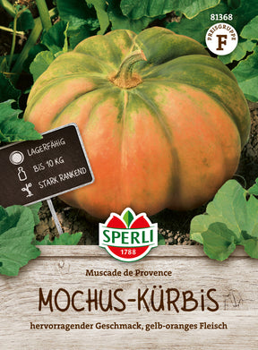 Der Kürbis 'Muscat de Provence' hat flachrunde, leicht gerippte, orangefarbene Früchte mit dezent grünlich-grauem Schimmer. Sie sind lange lagerfähig, erreichen ein Gewicht von 8 bis 10 kg und weisen einen hervorragenden Geschmack auf. Die kräftig rankende Pflanze kann von April bis Mai im Haus vorgezogen werden. Die Verpflanzung ins Freie erfolgt dann Mitte Mai. Alternativ können die Samen ab Mai auch unmittelbar im Freiland ausgesät werden. Für eine ertragreiche Kultur kommt es auf einen vollsonnigen und windgeschützten Platz sowie mittelschweren, nährstoffreichen Boden an. Außerdem muss 'Muscat de Provence' stets gut bewässert werden.