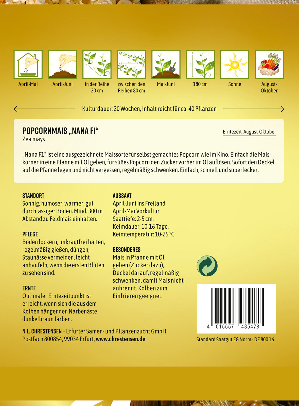 N.L. Chrestensen Popcornmais Nana F1 ist nicht auf Lager und wird versandt, sobald es wieder verfügbar ist
